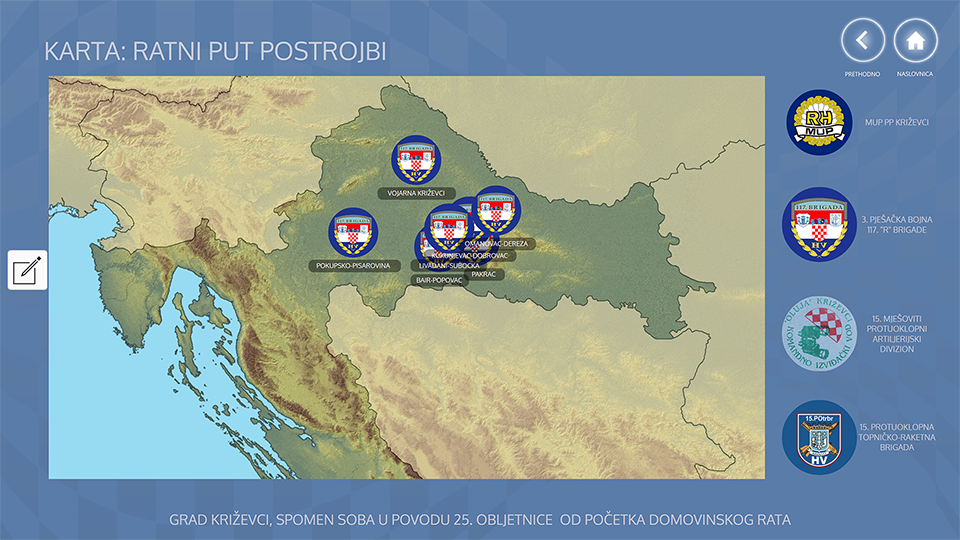 Na inicijativu Koordinacija udruga iz Domovinskog rata i Grada Križevaca, 17. rujna 2016.g. u Gradskoj knjižnici „Franjo Marković“ Križevci, svečano je otvoren opremljen izložbeni prostor od oko 30 m2 za potrebe Spomen sobe hrvatskim braniteljima. U spomen sobi su izloženi različiti materijali s tematikom domovinskog rata na području grada Križevaca i križevačkih ratnih postrojbi (priznanja, knjige, fotografije, video materijali, dokumentacija, isječci iz novina, vojne karte, vrijedna svjedočanstva ratnih događanja, i sl.), s ciljem da su dostupna građanima i drugim zainteresiranim osobama. Izloženi eksponati i video materijal služe za potrebe edukacije budućih generacija, ali i kao mjesto trajnog sjećanja. Spomen soba se može besplatno razgledati svakog radnog dana za vrijeme otvorenosti knjižnice. Ukoliko treba organizirati vodiča, potrebno se ranije najaviti na telefon ili na info pultu knjižnice.